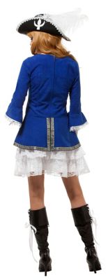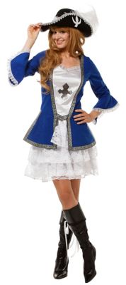Musketier-Kostüm für Damen, aus Waschvelours und Satin, bestehend aus Oberteil und Volant-Rock, Oberteil vorne mit Borten- und Rüschenbesatz, verziert mit Kreuz-Applikation, hinten mit Reißverschluss, Satin-Rock mit Volants aus Spitze und Gummibund, Farbe: blau/weiß, Länge Oberteil: bei Gr. 36 ca. 69 cm, Rocklänge: bei Gr. 36/38 ca. 37 cm. Material: 100 % Polyester.